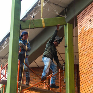 Las piezas metálicas fueron diseñadas, fabricadas y pintadas en taller, y posteriormente trasladadas al sitio de obra para su ensamblaje. Con la instalación de las planchas base y el replanteo de ejes estructurales, se inició el montaje de columnas y vigas, garantizando la estabilidad de la nueva edificación.